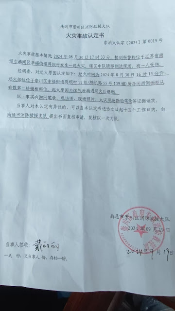 (維權網信息中心報道)2024年10月28日,本網獲悉:2024年8月30日16時15分,江蘇省南通市幸福街道蔣壩村11組(棉機路55號139幢)戴麗麗老太廚房間煤氣爆炸,導致戴麗麗老太受傷,部分衣物損毀。戴麗麗老太報警。公安消防安檢部門共20多人陸續趕到現場,進行調查。