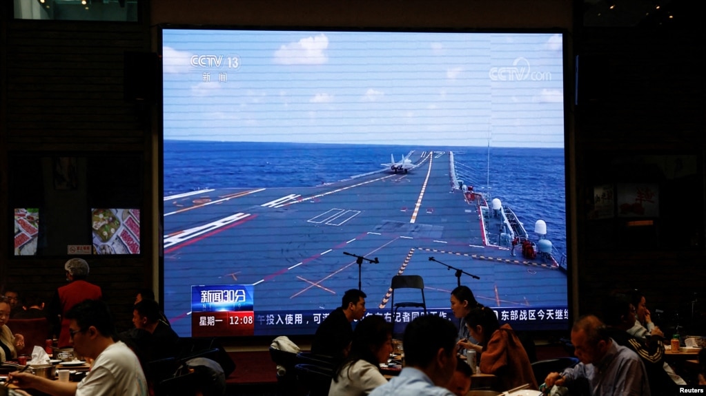 資料照: 民眾在北京一家餐館觀看電視屏幕上中國解放軍東部戰區在台灣周邊實施的「聯合利劍」演習。(2023年4月10日)