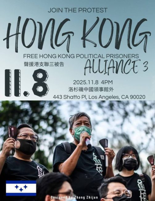 在2025年11月8日洛杉磯中國領事館舉行的中國民主黨全國委員會第763次茉莉花行動集會中,中國民主黨黨員呼籲國際社會持續關注香港支聯會三位核心成員——李卓人、何俊仁與鄒幸彤——遭長期羈押的情況,並要求中共與香港當局立即、無條件釋放三人。