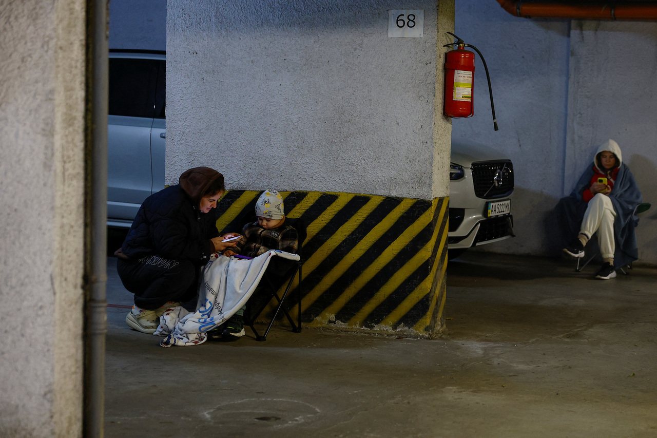 俄罗斯13日至14日夜间对乌克兰首都基辅发动大规模轰炸,民众在地下停车场躲避俄罗斯飞弹和无人机攻击。(路透)