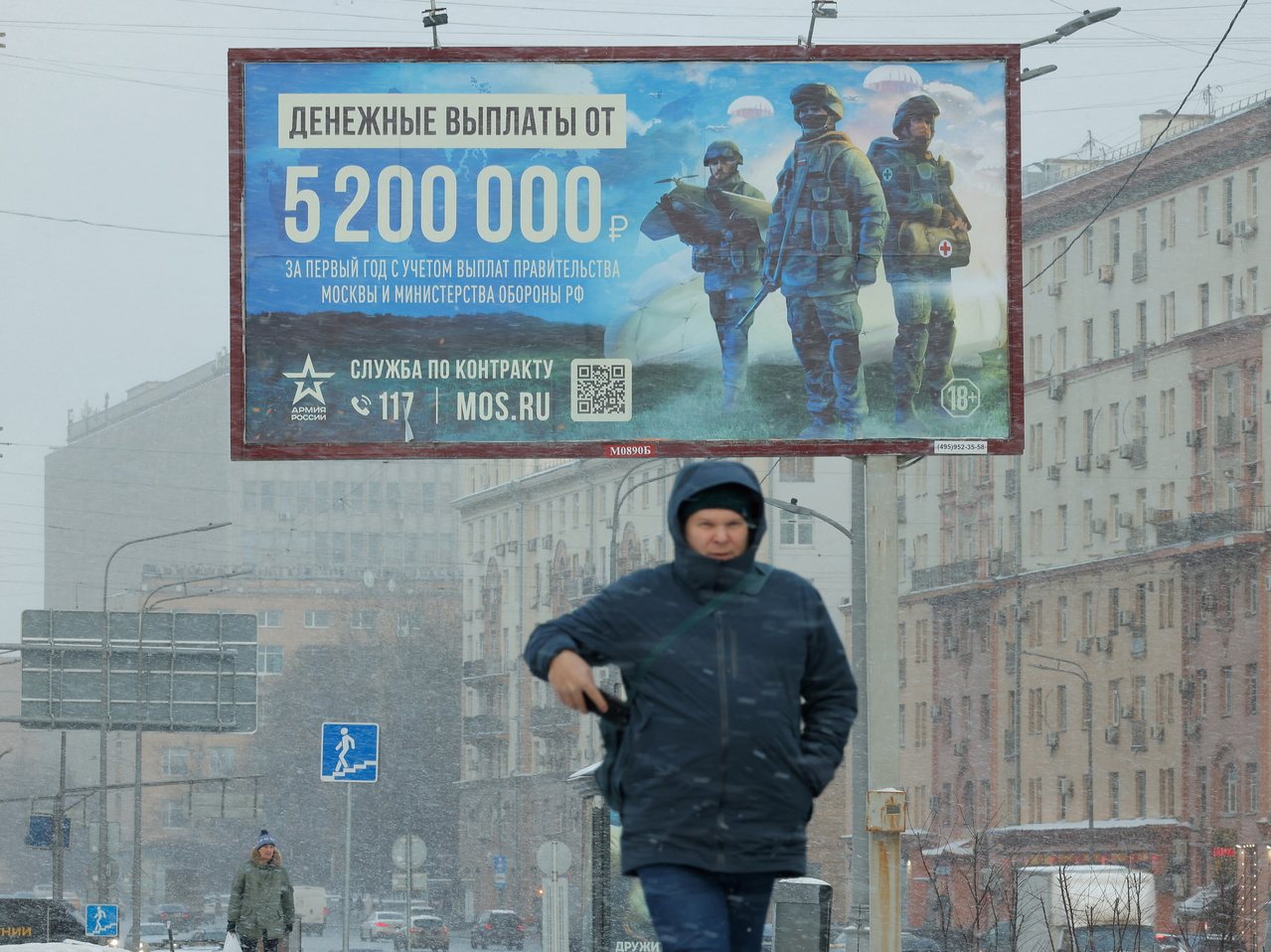 一名路人在俄罗斯莫斯科暴雪中行经一幅宣传俄军签约服役的看板。(路透)