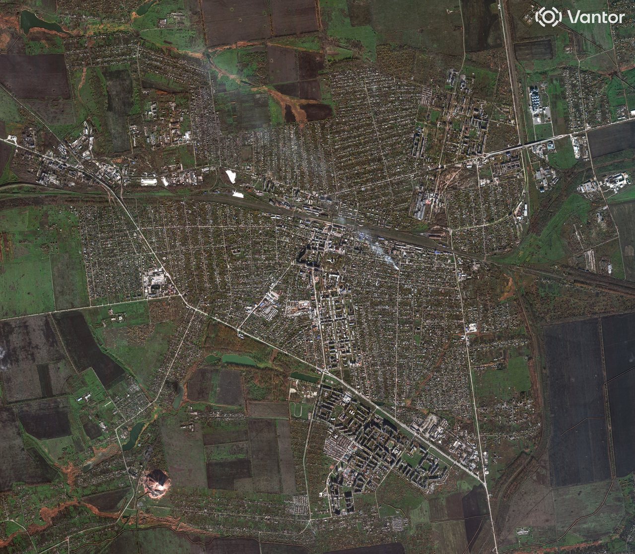 卫星影像显示2025年11月3日,乌克兰东部城市波克罗夫斯克的住宅区遭俄军攻击,浓烟升起。路透