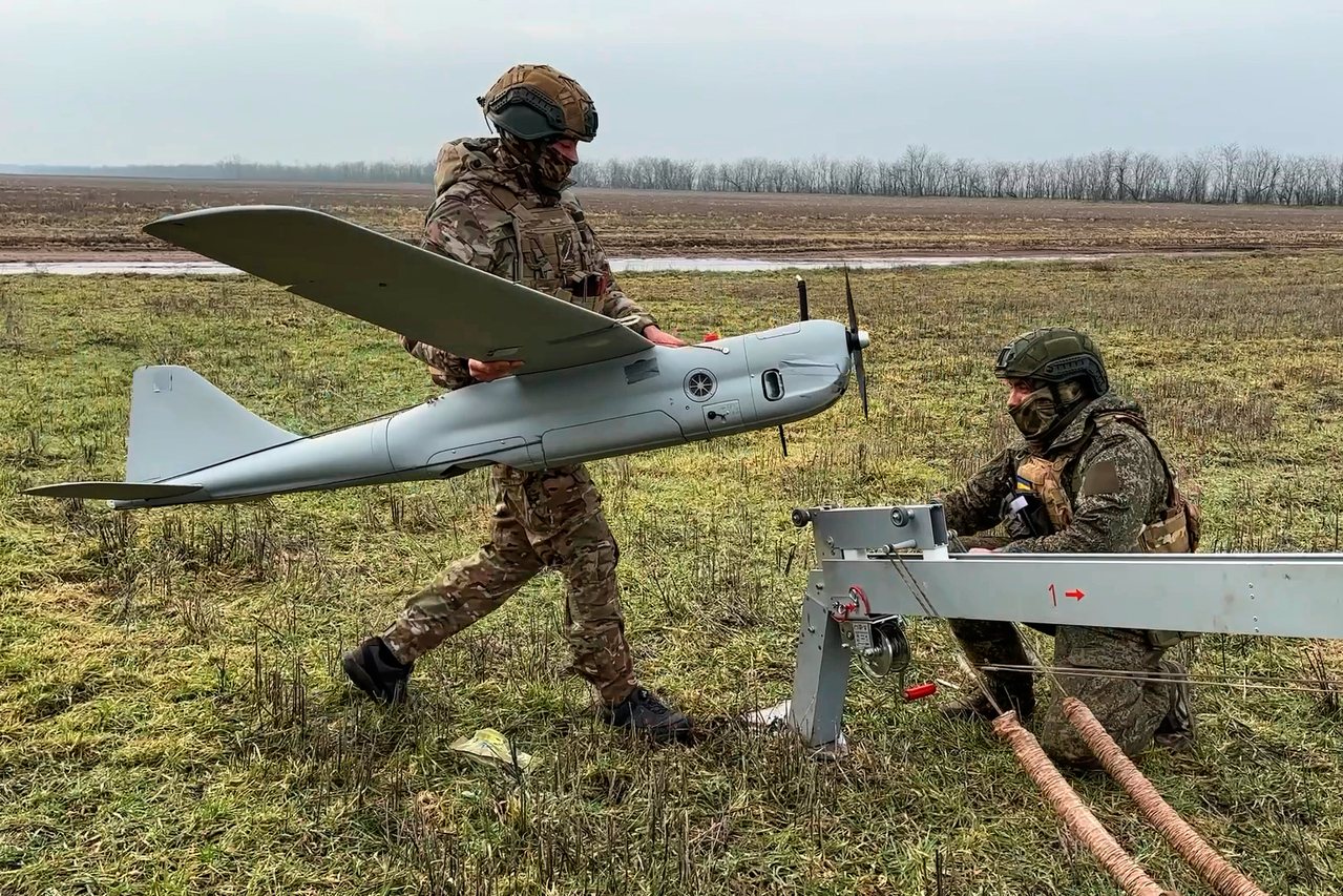 图为俄罗斯军人在乌克兰放飞一架侦察无人机执行任务,示意图。(美联社)