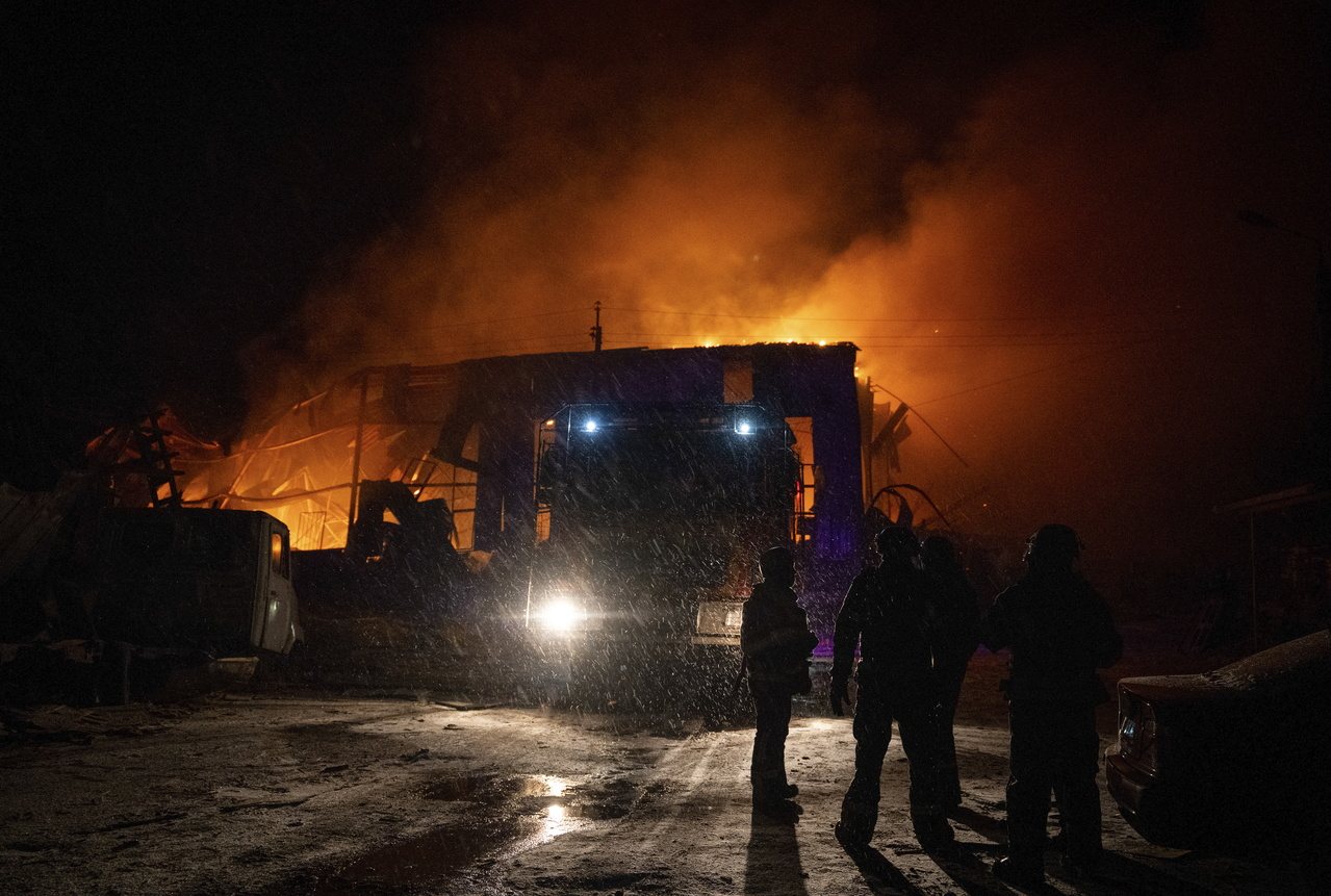 俄军17日晚无人机空袭斯拉夫扬斯克(Sloviansk),图为消防员在一处遭攻击的仓库现场进行抢救。欧新社