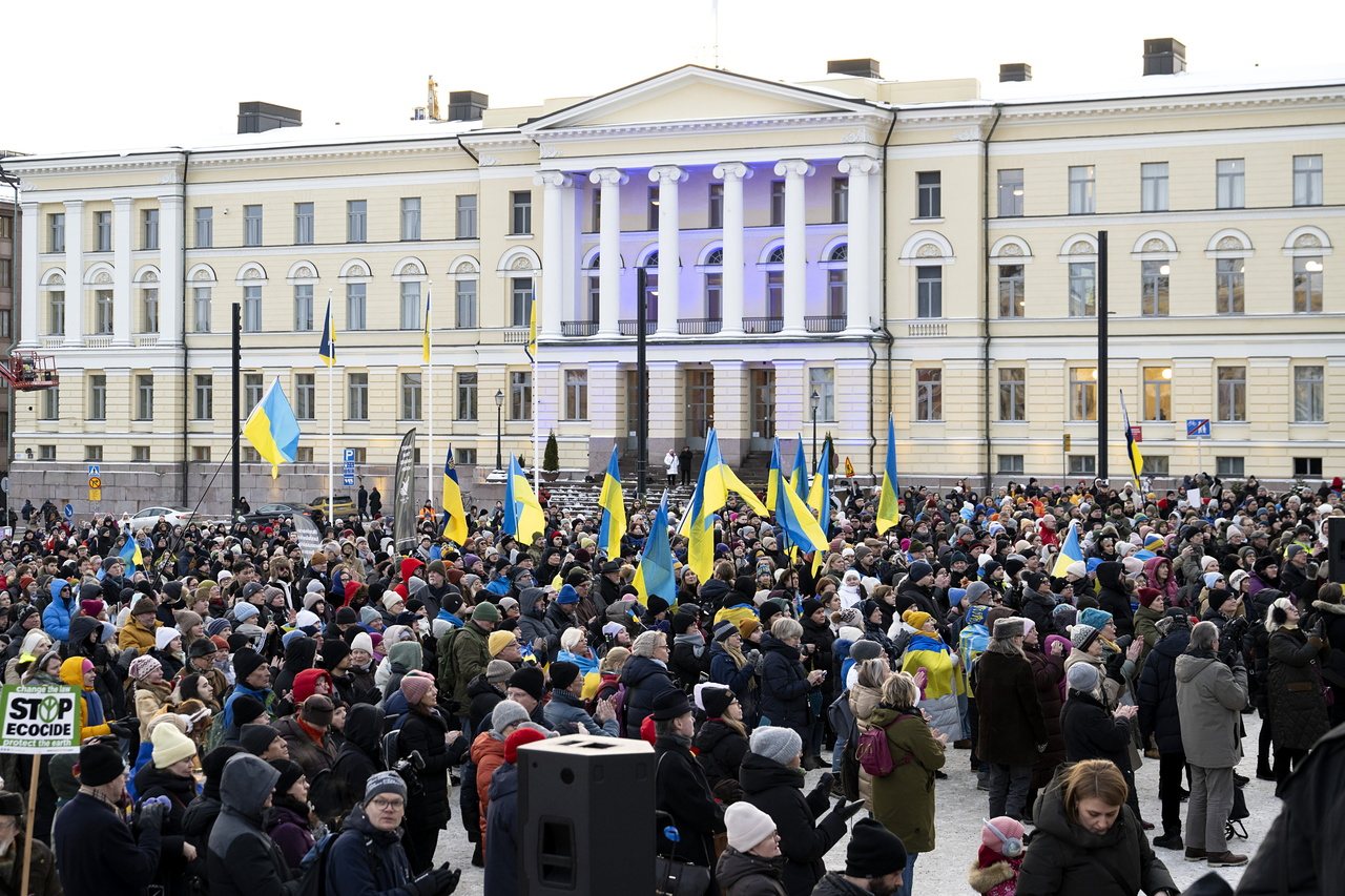 俄乌战争全面爆发4周年,赫尔辛基参议院广场(Senate Square)涌入大量声援人潮,民众高举乌克兰国旗和点蜡烛表达支持,场面肃穆。欧新社