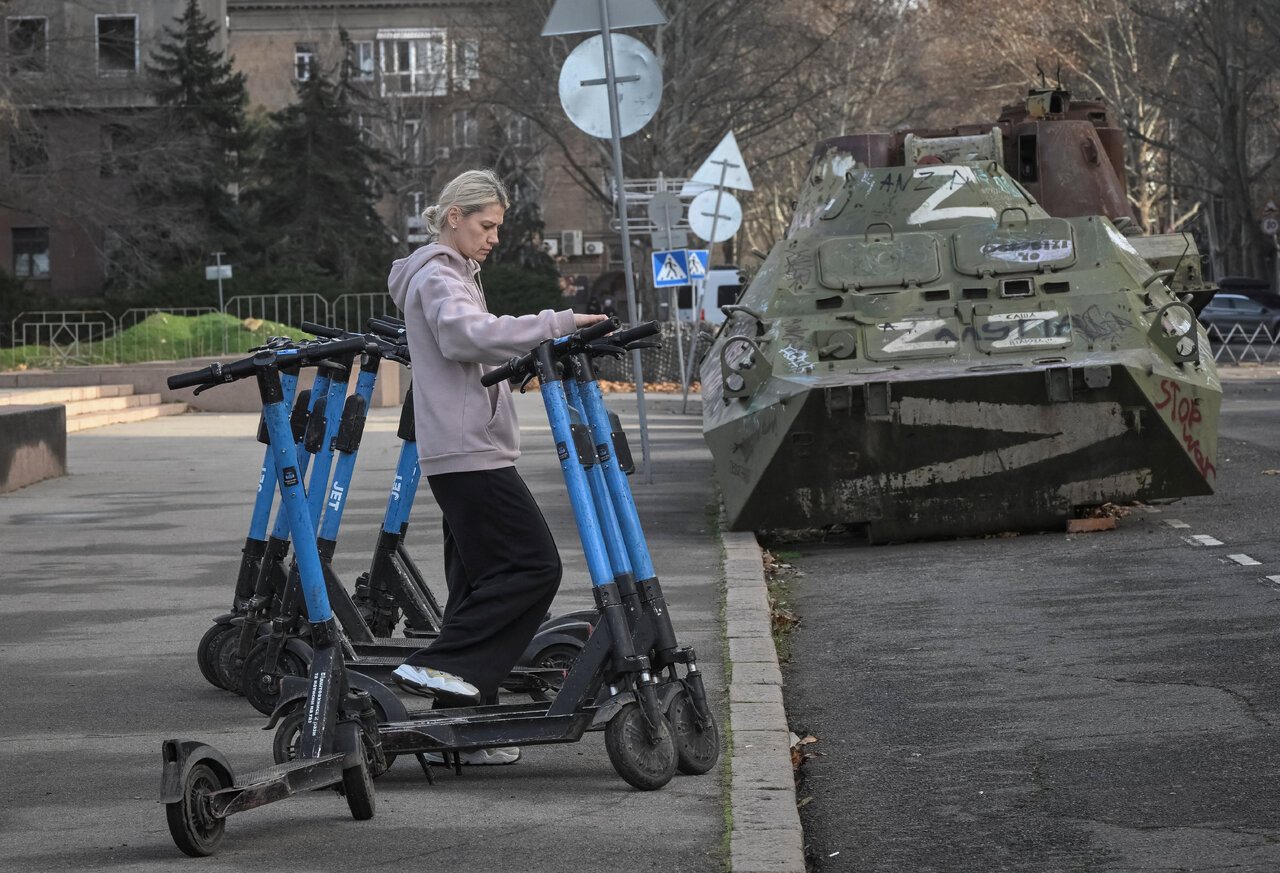 乌克兰尼古拉耶夫一名妇女在一部遭摧毁的俄国坦克旁,检查市内的公共电动滑板车。(路透资料照) 路透通讯社