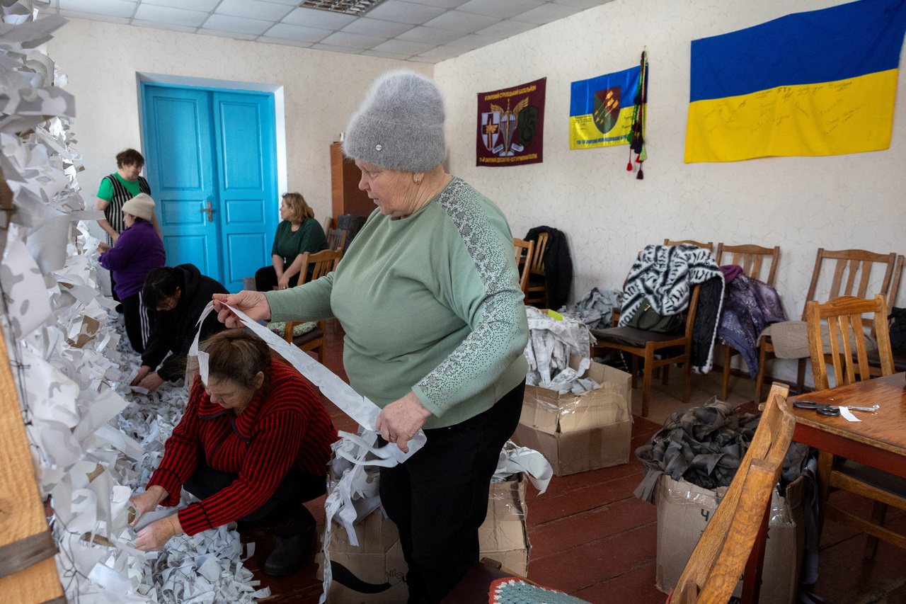 乌克兰妇女波普里亚杜希娜(前)与其他村民在泽泽利夫卡(Dzenzelivka)为前线编织伪装网。路透