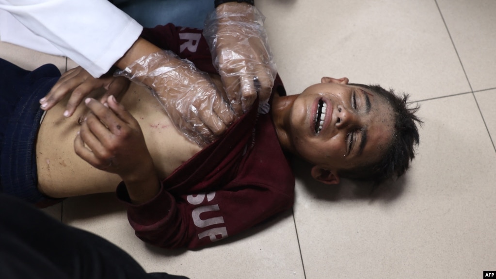 2024年10月10日,以色列袭击加沙地带中部代尔巴拉赫的一所收容流离失所者的学校后,一名受伤的巴勒斯坦男孩在阿克萨烈士医院接受治疗。