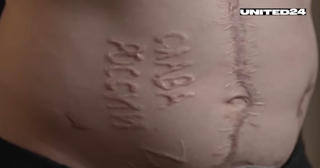 乌克兰战俘佩列韦泽夫指控,被俘期间遭俄兵在腹部右侧烙印「荣耀归于俄罗斯」,照片曝光可见明显伤疤,十分骇人。(取材自New York Post在YT的影音)