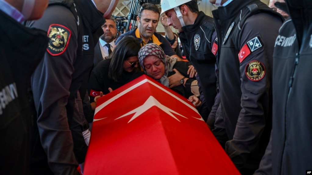 2024年10月24日哈桑·海珊·坎巴茲 (Hasan Huseyin Canbaz) 的親屬在安卡拉卡爾西亞卡清真寺舉行的葬禮上哀悼,他在星期三於土耳其航空航天和國防公司TUSAS遭到庫爾德工人黨成員的襲擊身亡。